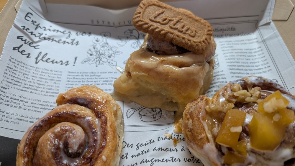 定番シナモンロールと、塩キャラメルのアイシングがたっぷりのと、アップルパイ風のシナモンロール。