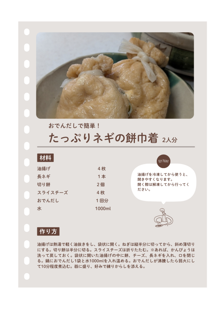 5分で副菜ざっくりレシピ3 料理のいろは X Facebook はてブ Pocket LINE コピー 2026.03.16 あまりがちな材料でほっこりメニューです。調味料はおでんのだしで一発OK。シンプル和食の定番です。 お餅が入っているのでボリュームもあり、ネギがたっぷりとれて風邪の予防にもおすすめです。