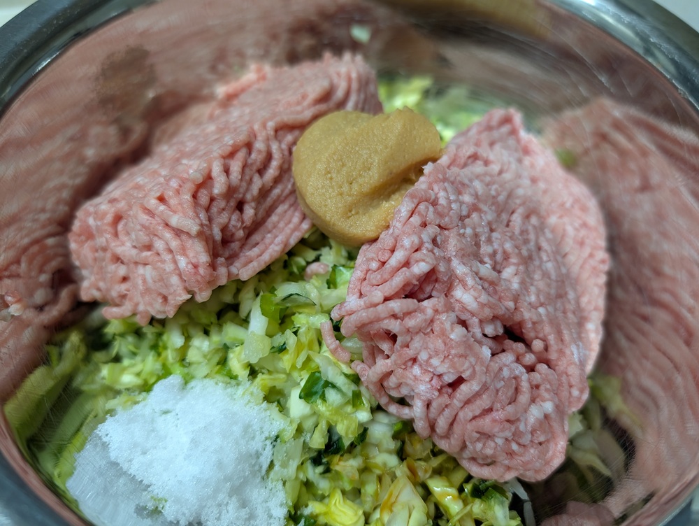 刻んで塩もみ後水気を絞ったキャベツとニラ、ひき肉を混ぜ、砂糖・醤油・味噌を各大さじ1ずつ加えてよく練ります。